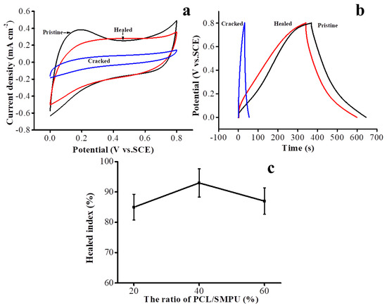 (a) CV curves of the MCP40S60 with different states collected at 5 mV s−1; (b) galvanostatic charge/discharge curves of MCP40S60 electrode film with different states collected at 0.2 mA cm−2; (c) healed index of the composite with different PCL contents.