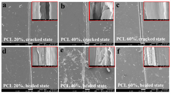 SEM images of the cracked areas before and after self-healing corresponding to 20% (a,d); 40% (b,e); 60% (c,f) PCL contents of the samples, respectively.