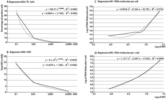 Correlation between multiplicity of infection (MOI), infected cells, Mean of Fluorescence Intensity (MFI) and RNA molecules. Each data corresponds to a single data point. (A) Regression between MOI and percentage of infected cells; (B) Regression between MOI and MFI; (C) Regression between MFI and viral RNA copies per cell; (D) Regression between MFI and viral RNA copies per positive cells. In graphs with 2 equations, the first one corresponds to a regression line equation (and R2 value) using the values shown on both axes; the second one corresponds to a regression line equation (and R2 value) using logarithm of the values shown on both axes. Dashed lines: regression curves.