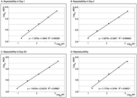 Repeatability and reproducibility. Linear regression between the observed fluorescence (AFI) and the expected MESF reported by the manufacturer of the beads employed as standard.