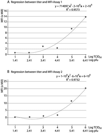 On the other hand, a significant correlation (R2 = 0.9559, assay 1; R2 = 0.9577, assay 2) was observed between the viral titre and the percentage of infected cells, by a second-degree polynomial regression (y = 2.8979x2 − 6.7267x + 5466, assay 1; y = 3.3423x2 − 6.2588x + 4.229, assay 2) (data not shown). More importantly, a clear correlation between viral titres and the MFI values was observed, also by a second-degree polynomial regression (Figure 3).