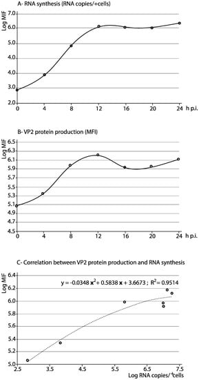 RNA production raised from around 102 copies per cell at 0 h p.i. (653.9 copies per positive cells; Table 4) to almost 3 × 105 copies/cell 12 h p.i., coinciding with the peak of VP2 production. Then it experimented a small increase until 24 h p.i. (up to 3.7 × 105 copies/cell) (Table 4 and Figure 4A). The intracellular VP2 fluorescent signal rose from 115073 MFI at 0 h p.i. to 1321944.9 at 24 h p.i., corresponding to an increase from 6.3 to 51.9% positive cells. As shown in Figure 4B, a peak of VP2 production was detected at 12 h p.i., coinciding with the maximum level of viral RNA (corresponding to the VP2 sequence) detected in the cells. Furthermore, a significant (R2 = 0.9514) second degree polynomial regression between RNA synthesis and VP2 protein production was observed (Figure 4C). In addition, we applied a Pearson correlation test to the FITC+ data, confirming that the increase of VP2 fluorescence positively correlates (Pearson’s r = 0.8913) with the RNA detected in the sorted positive cells. Although the linearity was weak, correlation was significant (α = 0.05), with p (two-tailed) = 0.0061, and the 95% confidence interval from 0.4201 to 0.9839.