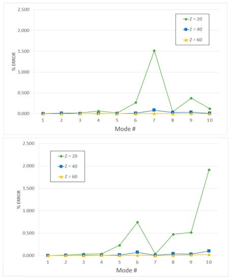 Thus, in order to increase the accuracy of the ROM generated with the two-step approach, the 2nd and the 3rd sets of ROMs are generated with Z1 = 120 and Z1 = 180, respectively. In Figure 7, the effect of the number of modes of the 1st reduction (Z1) is shown for the first 10 natural frequencies associated with h = 1.