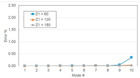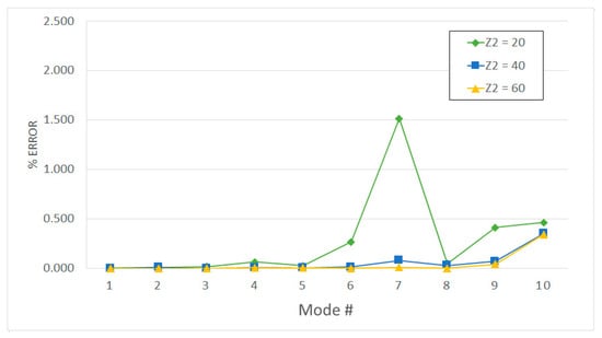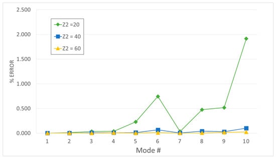 All of the curves refer to ROMs with the same size (Z2 = 60) as the final one generated with the direct method (Figure 4). It is observed that increasing the number of modes retained in the 1st step significantly affects the accuracy of the final ROM, specifically for modes #9 and #10. This behavior agrees with the interpretation given about the results in Figure 5 because of the (fixed) boundary conditions applied to the disk interfaces, and the reduction basis used in the 1st step must include a number of modes (Z1) significantly higher (up to three times) than the number of modes retained in the 2nd step (Z2), to accurately represent the dynamics of the bladed disk.