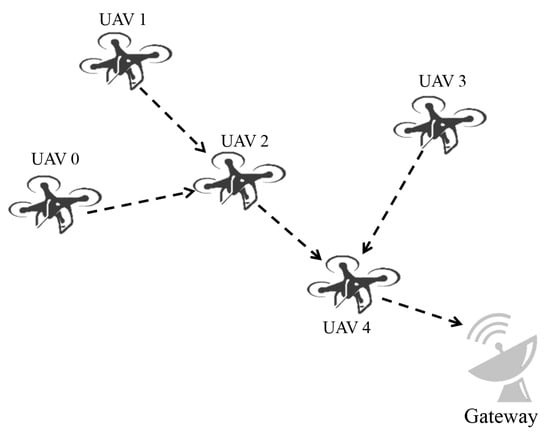 The UAVs in the network infrastructure should forward the data from the mobile devices to the Internet gateway (uplink) and from the gateway to the mobile devices (downlink). In the multi-hop communication, the same phenomenon introduced in Section 3.2 should be considered in chain. For example, if the UAV 0 in Figure 2 tries to transmit the data to UAV 2, the UAV should contend with the UAV 1 to use the medium. Also, the contention between the UAV 2 and the UAV 3 affects the throughput of the data received from the UAV 0 or the UAV 1. If we let refer to the set of the UAVs included in the routing path to the GCS (e.g., in Figure 2), the actual throughput (received data rate of the GCS) becomes