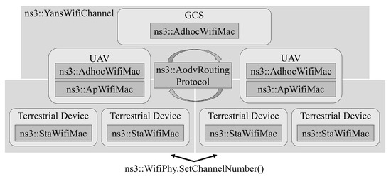 There are subnetworks, one for ad hoc and for APs. Internet Protocol (IP) addresses for the UAVs and the GCS is pre-assigned at the simulation environment install step. For the terrestrial nodes, IP addresses could be changed dynamically, no IP address is assigned in advance. However, it should be noted that ns-3 does not support automated Wi-Fi selection scheme internally. Mobile nodes cannot change the IP address dynamically by scanning the around APs and change the connection. To resolve the phenomenon, we explicitly probed the APs nearby each mobile node and reassigned the IP address in a certain period. In our implementation, the AP scan occurs per 3 s. Also, we employed Ad hoc On-demand Distance Vector (AODV) routing protocol [38] for the ad hoc network. In our previous work, we found that AODV outputs the best performance of the ns-3 supporting routing protocols for the ad hoc networking in terms of the connectivity and the data rate. Finally, to focus on the PHY to the Network layer performance, we employed User Datagram Protocol (UDP) protocol to reduce the transport layer overhead of the simulation.