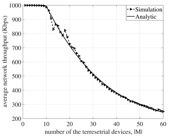 By using the simulation addressed in previous subsections, we verify the network throughput model of multi-UAV-based network infrastructure. At first, we observe the dynamics of , which is the basis of the network throughput models addressed in this paper. To estimate of , we run the simulation with a single UAV and the varying number of the terrestrial devices , and measure the network throughput. The devices are spread in the 20 m × 20 m area on the ground, and the GCS is located at the center of the ground, which is set to the origin. A single UAV is deployed at , and the devices preliminary receive the IP address included at the subset of the UAV. GCS sends data to all of the devices in 1000 Kbps data rate equivalently, and the average network throughput is calculated by the average received data rate among the devices. Each case is simulated by 10 times with 300 s runtime, and varies to . Figure 6 shows the simulation result and the analytic solution where and .