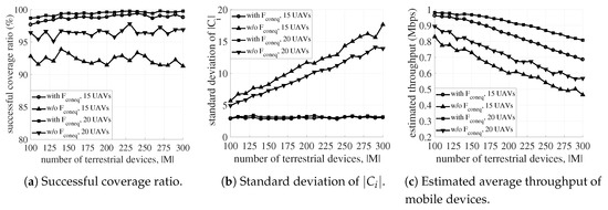 To observe the dynamics of the formation algorithm, we performed numerical evaluation while varying the number of the terrestrial devices from 100 to 300, as shown in Figure 8. For each value, we performed the formation algorithm 50 times for the case with and without and recorded after the formation is stabilized. Successful coverage ratio in Figure 8a is calculated by , which results in the ratio of the connected mobile devices and the total devices. The case with outperforms the case without independent to , since not only equalizes the WLAN congestion but pushes the edge-located UAVs out to search the unconnected devices. Also, the case with and 15 UAVs cover greater number of the devices than the case without and 20 UAVs, which means that can result the better coverage ratio with fewer UAVs. Figure 8b shows the standard deviation of . As shown at the example of Figure 7, standard deviation of the case with is much less than the case without . Also, as increases, standard deviation of the case without increases, but the case with does not change since keeps equalized. Estimated throughput refers to the average of the devices’ throughput calculated by Equation (5) with , assuming that each device sends data packet with rate . Due to the network capacity of the AP and the congestion, estimated throughput has no choice but to decrease as increases. However, as previously verified in Figure 6, decreasing the number of can reduce the loss of the throughput. The case with and 20 UAVs results in the best throughput on the evaluation, while the difference grows as increases. To provide the better quality of the devices, increasing the number of the UAVs could be the easiest way, but it might not bring the meaningful changes in terms of the coverage (Figure 8a) or the standard deviation (Figure 8b). Dynamically adjusting the number of the UAVs can be the promising strategy to improve the UAV-based network infrastructure.