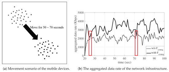 We also simulate the network throughput of the multi-UAV-based network infrastructure using the formation control algorithm. Since there is no existing method considering the formation of the UAVs of the network infrastructure, we compare the two cases where one applies and the other does not apply . The comparison is valid since the formation without shows hexagonally patterned deployment of the UAVs, which is widely used in the placement of the wireless network infrastructure [39]. We firstly deployed the mobile devices with a cluster centered at in the map, and let the devices move in the direction , as shown in Figure 9a. The devices start to move at 50 s from the start of the simulation, and stop to move at 70 s. The devices send packets to the GCS with 100 Kbps after the 20 s from the start of the simulation, and the network throughput is measured per second. Figure 9b shows the changes of the network throughput with respect to the time for two cases.