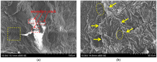 A fatigue test of the 6082 aluminum alloy T-welded joint was carried out. The fatigue fracture of the T-welded joint was analyzed by SEM. It was found that the fatigue source area was the pore of the weld root, and the fatigue crack was cracked by the pore. Crack stress-intensity factor ∆K was near the threshold value ∆Kth, and the crack was in the slow-expansion phase (Figure 9a). In Figure 9a, it was found that there were many secondary microcracks perpendicular to the fracture surface on the fracture surface. Figure 9b is an enlarged view of the yellow square of Figure 9a, in which there was a distinct ductile-fracture characteristic, where a large number of tearing ribs were present, which were caused by crack propagation in different planes. It can be observed in Figure 9b that the two tear edges eventually merged to form one tear edge (shown by a yellow arrow), which reflected the direction in which the crack extended from bottom to top. It can also be observed in Figure 9b that the cleavage-like step also illustrates the presence of cleavage-fracture characteristics at the fracture. Figure 9c shows the instantaneous break zone in the fatigue fracture, and it can be observed from the figure that semielliptical tear-shaped dimples are composed entirely of the instantaneous break zone, which is why these dimples are tear-shaped. At the same time, it can be observed that the size of the dimples is small, because they are due to fatigue cracks that are generated during the fracture process through the second-phase particles. The size of the second-phase particles in the weld of the 6082 aluminum alloy MIG welding was also small, which caused a smaller size-tearing dimple. It can be observed from the figure that the direction of the semicircular dimple opening was mainly in the direction indicated by the arrow, that is, the direction in which the main crack extended.