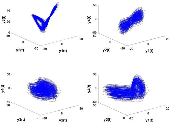 The authors of [28] showed that, subject to , the system always exhibits hyperchaotic behavior. Hence, we choose the arbitrary fractional order . System (30) was proposed as the fractional counterpart of the integer-order hyperchaotic system proposed in [29]. A new modified generalized projective synchronization scheme was developed for (30) and applied to a secure communication system in [28].