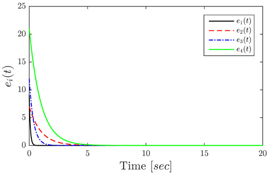 to zero as . Recall from Remark 1 that our choice of matrix and function can lead to different types of conventional synchronization schemes. In the following, we present numerical results confirming the validity and convergence of the proposed control schemes for , , , respectively.
