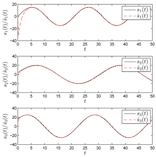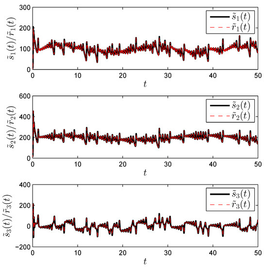 In this section, we present some numerical simulations that verify and illustrate the effectiveness of the theoretical analysis in Section 3. It is noted that the Adams–Bashforth–Moulton method with the step size 0.001 [25,26]. We consider as master the fractional order permanent magnet synchronous motor (PMSM) model presented in [27]. A PMSM is a type of alternating current (AC) synchronous motor that uses permanent magnets to produce torque even at zero speed and can have a higher torque density compared to other types of motors. In terms of its mathematical model, it is considered a nonlinear coupling system with multiple variables. Traditionally, the PMSM was modeled as an integer-order dynamical system, which only takes into consideration the local knowledge of the states and inputs. The basic idea behind the fractional model in [27] is that, unlike integer calculus, fractional calculus involves an infinite number of terms. These terms can be employed to represent the past history of an arbitrary dynamical system. The considered model is of the form