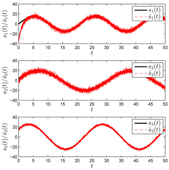A simple communication system was developed in [28] where system (30) was used as both the master and slave. In our case, we will consider the same master–slave pair from the previous section, i.e., (29) and (30) yielding the pair