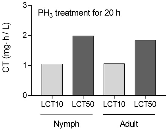 Lethal concentration values due to PH3 treatment are displayed in Figure 1. There were no dramatic changes in LCT values between developmental stages of M. persicae. However, adults M. persicae were slightly more susceptible to PH3 fumigation than aphid nymphs.