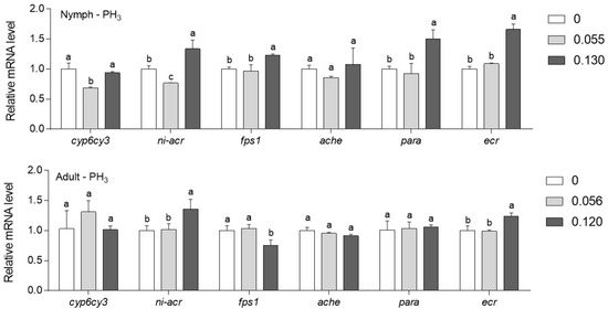 Gene expressions in the phosphine-treated M. persicae determined by RT-qPCR. Six gene primers are listed in Table S1. Different letters on the bars indicate statistical differences between phosphine-treated samples and the control (p < 0.05). Statistic differences were tested using one-way ANOVA and Tukey’s test as a post-hoc test. Treated concentrations were equivalent to LC10 (0.055 mg/L for nymphs or 0.056 mg/L for adults) and LC50 (0.130 mg/L for nymphs or 0.120 mg/L for adults) values.