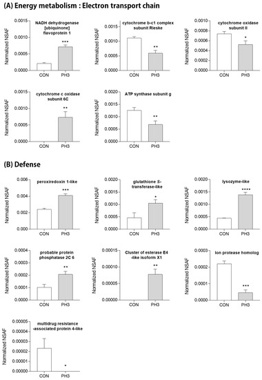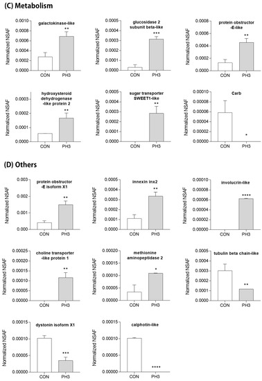 Proteins differentially expressed in adults of Myzus persicae after phosphine treatment at the concentration of 0.5 mg/L for 4 h. CON; control treatment group, PH3; phosphine treatment group. Statistically difference was analyzed using t-test (p < 0.05). *, <0.05; **, 0.01; ***, 0.001; ****, 0.0001. (A), proteins involved in energy metabolism, especially electron transport chain; (B), proteins involved in defense; (C), proteins involved in metabolism; (D), other proteins.