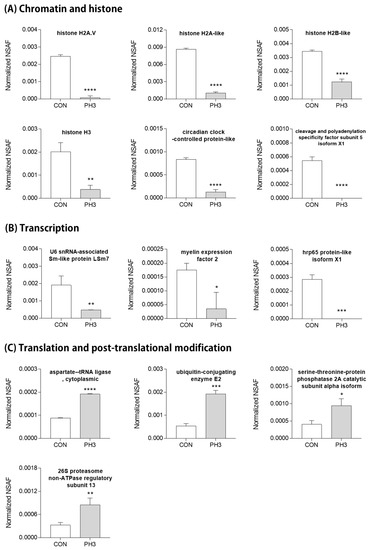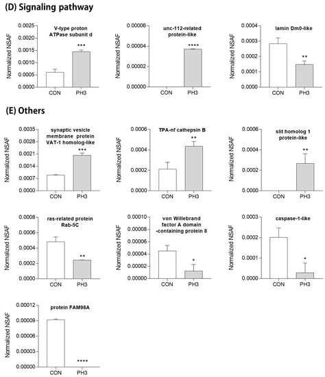 Proteins differentially expressed in adults of Myzus persicae after phosphine treatment at the concentration of 0.5 mg/L for 4 h. CON; control treatment group, PH3; phosphine treatment group. Statistically difference was analyzed using t-test (p < 0.05). *, <0.05; **, 0.01; ***, 0.001; ****, 0.0001. (A), proteins classified in chromatin and histones; (B), proteins involved in transcription; (C), proteins involved in translation and post-translational modification; (D), proteins involved in signaling pathways; (E), other proteins.