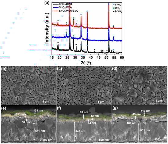 (a) XRD patterns of SnO2/WO3/BiVO4. Scanning electron microscopic (SEM) top images of (b) SnO2 50 nm/WO3 100 nm/BiVO4 (c) SnO2 50 nm/WO3 50 nm/BiVO4 (d) SnO2 100 nm/WO3 50 nm/BiVO4. SEM cross-section images of (e) SnO2 50 nm/WO3 100 nm/BiVO4 on FTO substrate (f) SnO2 50 nm/WO3 50 nm/BiVO4 (g) SnO2 100 nm/WO3 50 nm/BiVO4.