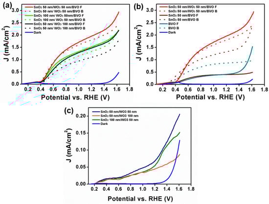 Recently, there have been few reports of BiVO4 with heterojunction showing enhanced water oxidation performance under front illumination [,]. A thin film of BiVO4 was found to exhibit superior performance during front illumination []. BiVO4/WO3 type II heterojunctions have been intensively constructed in order to improve the light absorption capacity []. SnO2 thin films were found to be a hole blocking layer for BiVO4 []. Nanorods of SnO2 have also been used to improve the performance of BiVO4, especially under front illumination [,,]. Double heterojunction of BiVO4 with SnO2 and WO3 has been fabricated to achieve an unassisted water splitting reaction []. However, studies on heterojunction photoanodes tuning the front illumination are rarely found in the literature.