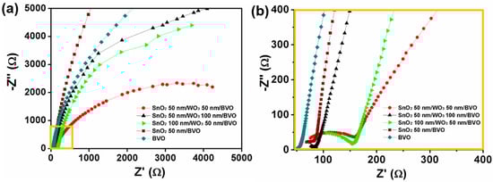 Further, charge transfer properties have been investigated by Nyquist plots. Figure 3 depicts the Nyquist plots of SnO2/WO3/BiVO4 photoanodes. EIS were measured at 1.23 V vs. RHE under 1 Sun illumination. Nyquist plots were fitted with the equivalent circuit, using Zview software; they are presented in Figure 3 and Supplementary Material S2. Parameters extracted from the Nyquist plots are listed in Supplementary Material Table S1. In the equivalent circuit, Rs represents solution resistance, and Rct can be ascribed to charge transfer resistance at the electrode/electrolyte interface. Generally, a smaller semicircle represents the higher ability of charge transfer property of the photoanode. It is clearly evident from Figure 3 and Table S1 that the charge transfer resistance for SnO2 50 nm/WO3 50 nm/BiVO4 is lesser than that of SnO2 50 nm/BiVO4 and other thicknesses of SnO2/WO3/BiVO4 photoanodes. It demonstrates that, as the SnO2/WO3 layer is introduced beneath the BiVO4 layer, the charge transfer resistance dramatically decreases compared to the pristine BiVO4. This trend is in line with pec performance. As the thickness of WO3 and SnO2 increases from 50 nm, the electrical resistance increases. It indicates that the SnO2 50 nm/WO3 50 nm/BiVO4 has high charge separation efficiency and high water oxidation kinetics.