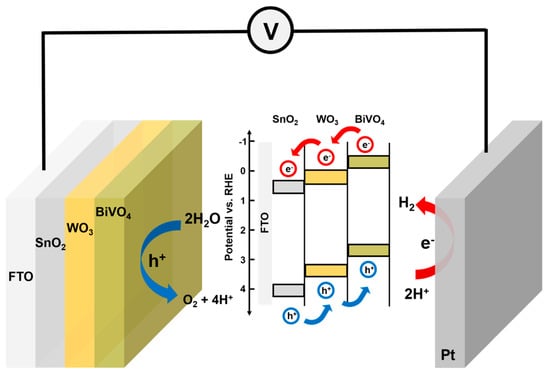 Previous report demonstrated that the photoelectrochemical property of WO3/SnO2/BiVO4 is inferior to that of SnO2/WO3/BiVO4 []. Therefore, we have restricted our study only to the SnO2/WO3/BiVO4 system. It is known from the literature that introducing SnO2 under the BiVO4 layer enhances pec performance [,,]. The SnO2 layer enhances the charge transfer properties of BiVO4 by suppressing the possible recombination that can occur at the interface of SnO2/BiVO4. When the WO3 layer is introduced between SnO2/BiVO4, the charge separation can be further enhanced, as seen from Figure 2a, where the photocurrent increased after the insertion of WO3 layer. It is evident from the published results that the heterojunction of nanostructured WO3/BiVO4 performs better than either of the individual materials due to the formation of type II heterojunction [,]. Since the band positions of both materials are suitable to construct type II heterojunction, significant separation of the photogenerated electron hole pairs can be achieved to enhance pec performance. The photogenerated electrons are transferred from BiVO4 to WO3, which has excellent electron transport property compared to BiVO4. While WO3 improves the electron transport properties, BiVO4 enhances the overall optical property of WO3 in heterojunction of SnO2/WO3/BiVO4. It is also proved in the literature that the lifetime of the photogenerated holes increases in the heterojunction compared to the individual material []. However, the photoelectrochemical enhancement in WO3/BiVO4 is limited by the efficient transfer of the electrons from WO3 to BiVO4. From this point of view, the double heterojunctions of SnO2/WO3/BiVO4 would certainly enhance pec performance, as can be seen from the LSV curves of SnO2/WO3/BiVO4. The schematic diagram depicting the mechanism of water splitting is demonstrated in Figure 5.