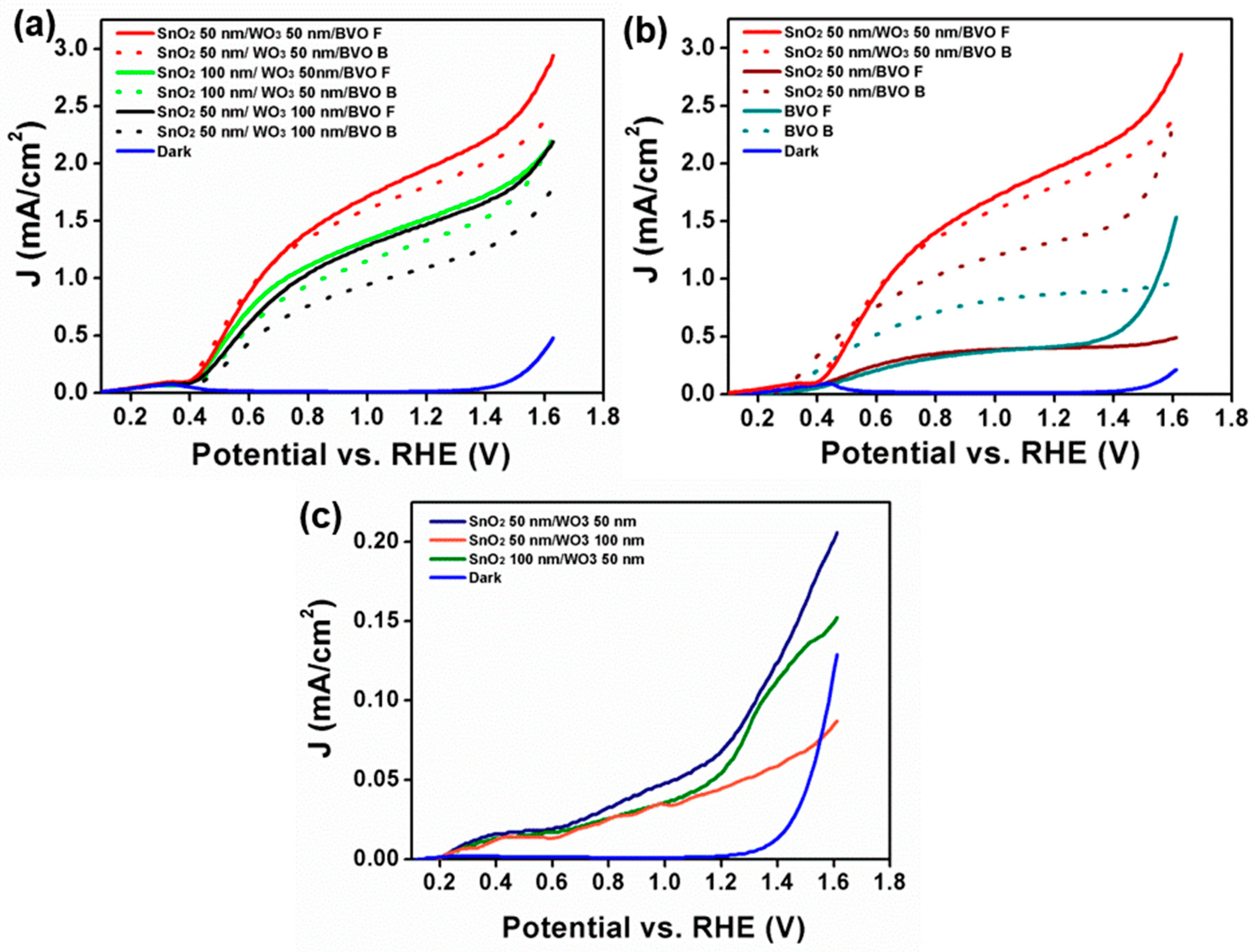 Photoelectrochemical properties of triple planar heterojunction were evaluated in three electrode configurations, using aqueous Na2SO3 with buffer solution as electrolyte (pH 7). Figure 2a presents LSV diagrams of SnO2/WO3/BiVO4 photoanode under one sun illumination. The photocurrent obtained from front and back illumination behavior was compared for different thicknesses of SnO2. We have noticed that the photocurrent obtained from front and back illumination varies with the thickness of the SnO2 and WO3. Among various thicknesses of SnO2 and WO3 in SnO2/WO3/BiVO4, SnO2 50 nm/WO3 50 nm/BiVO4 triple planar heterojunction exhibits superior performance compared to SnO2 100 nm/WO3 50 nm/BiVO4, and SnO2 50 nm/WO3 100 nm/BiVO4. SnO2 50 nm/WO3 50 nm/BiVO4 shows photocurrent density of ~2.01 mA/cm2 at 1.23 V under front side illumination, while the photocurrent during back illumination is 1.80 mA/cm2. As the thickness of WO3 increases to 100 nm, photocurrent density decreases. However, SnO2 50 nm/WO3 100 nm/BiVO4 shows a high photocurrent under front illumination compared to its back illumination. It is interesting to note that the behavior of the front and back illumination is unaffected by increasing the thickness of WO3. Figure 2b presents the LSV of SnO2 50 nm/BiVO4 under directional illumination. SnO2/BiVO4 photoanode shows ~1.2 mA/cm2 at 1.23 V during backside illumination, while it shows a photocurrent density of ~0.5 mA/cm2 under front side illumination. Photoelectrochemical properties of heterojunction SnO2 50 nm/WO3 50 nm are shown in Figure 2c.