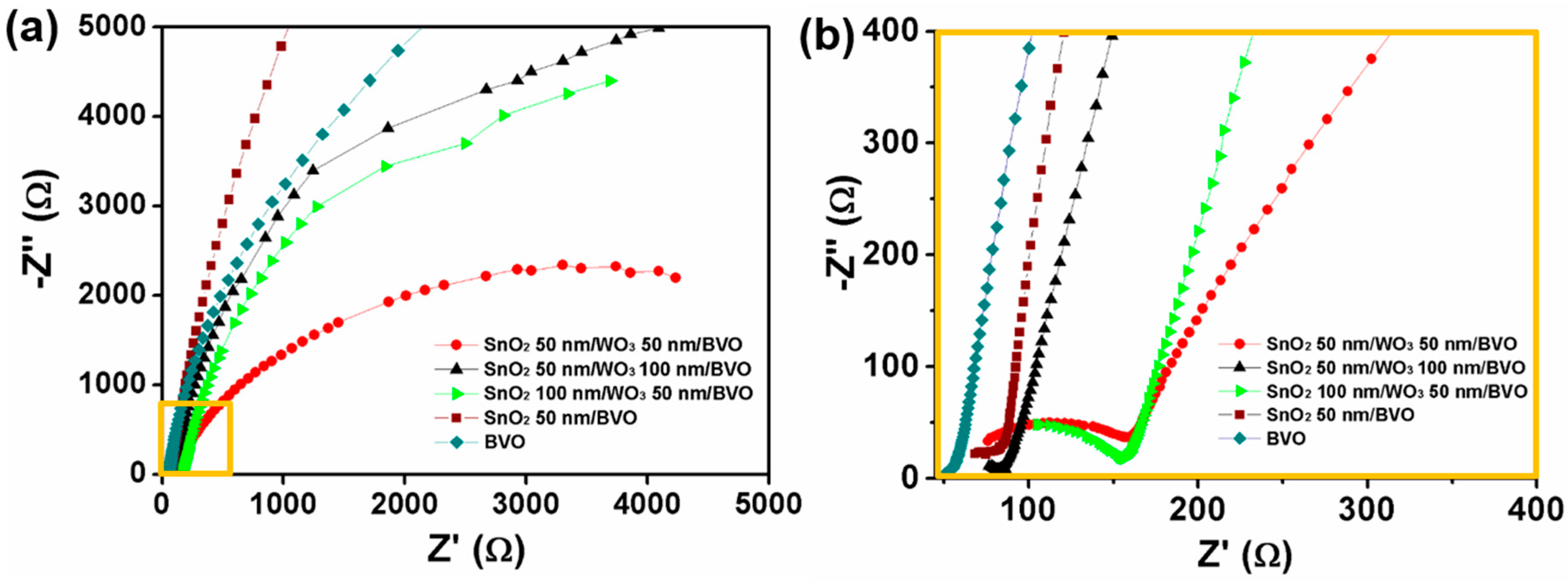(a) Electron impedance spectra (EIS) of SnO2/WO3/BiVO4; (b) Zoomed region of EIS spectra of (a) for SnO2/WO3/BiVO4 photoanode, measured using a three-electrode configuration set up in an aqueous phosphate buffer (pH 7.0) with 0.5 M Na2SO3 at 1.23 V vs. Reversible hydrogen electrode (RHE).