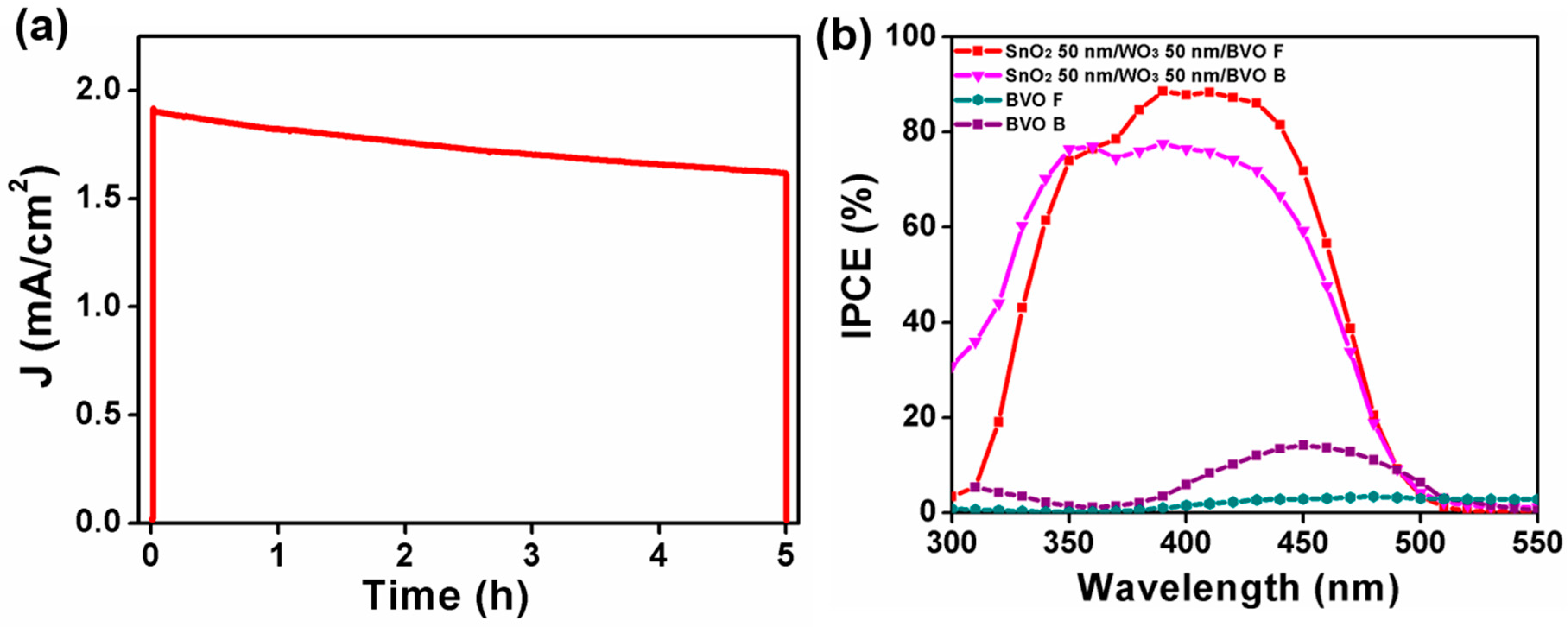 (a) Stability measurement for SnO2/WO3/BiVO4; (b) Incident photon to current conversion efficiency (IPCE) of SnO2/WO3/BiVO4 photoanode measured using a three-electrode configuration set up in an aqueous phosphate buffer (pH 7.0) with 0.5 M Na2SO3 at 1.23 V vs. RHE.