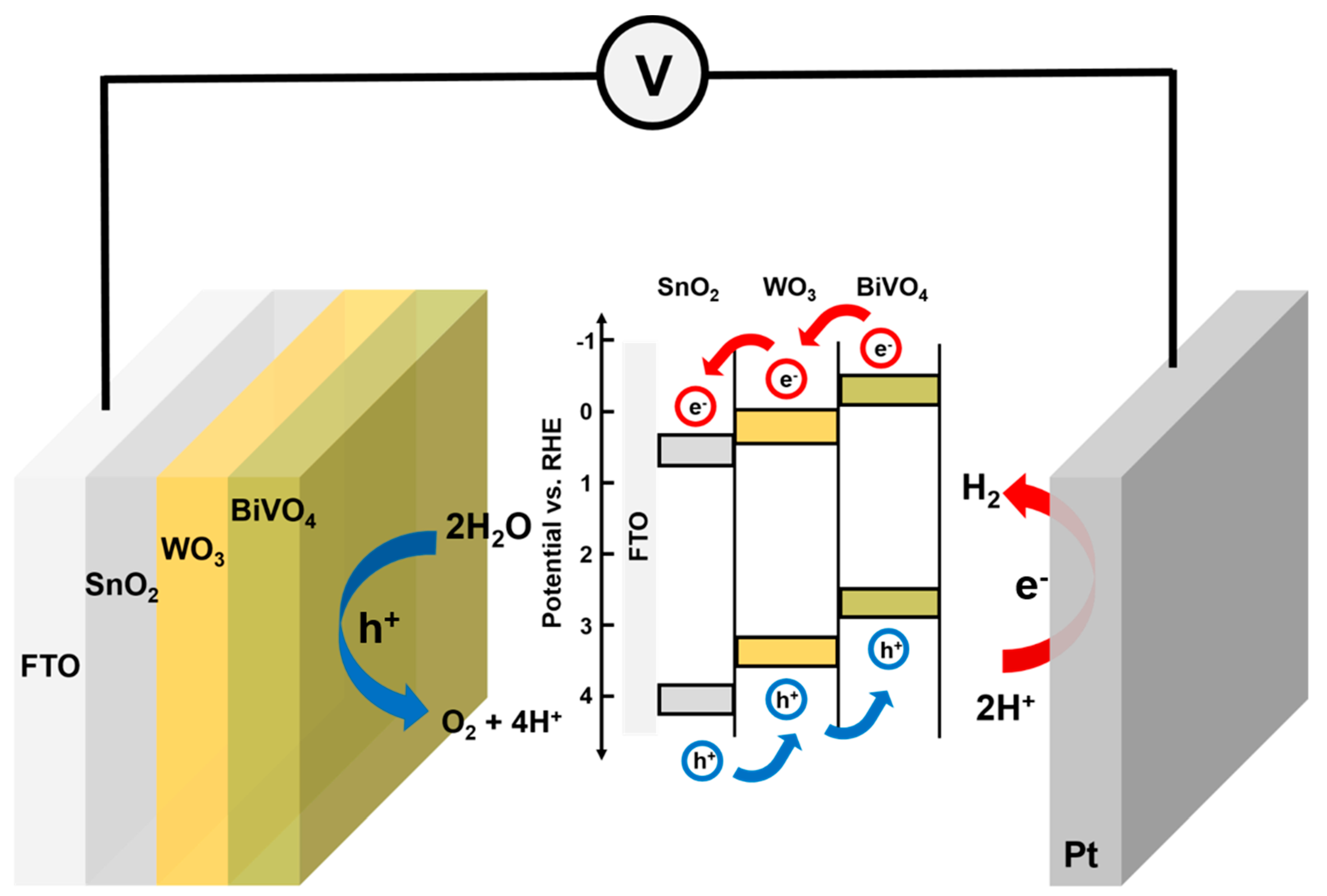 Schematic diagram for SnO2/WO3/BiVO4, depicting the mechanism of water splitting.