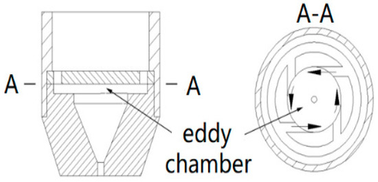 Swirl nozzle is one kind of spray nozzle that has been widely used in many industrial fields [31]. Soltani, M.R. [32] performed an experimental investigation to explore the characteristics of sprays produced by a liquid-liquid coaxial swirl atomizer. The results indicate that the maximum Sauter Mean Diameter of droplets along the injection axis moves to the outer periphery of the spray and increases downstream. In this paper, a swirl nozzle is developed for generating water spray for dust control in coal mines, as shown in Figure 1. The nozzle can not only convert the liquid pressure into the kinetic energy of the liquid, but also produce the liquid eddy to form a conical cavity in the center of the swirl chamber so that the eddied liquid in the form of a liquid film sprays out at high-speed from the nozzle. The liquid, after leaving the nozzle, is no longer restricted by the inner wall of the nozzle and spreads into the air. The slight disturbance of the air acts on the high-speed jet to form a turbulent wave. The amplitude of the disturbance increases when the kinetic energy of the small volume liquid is greater than the surface tension of the liquid, and the liquid film breaks and forms small fog particles under strong vibrations.