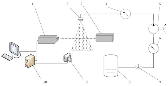 Experiments were conducted to study the performance of the swirl nozzle. A dedicated test system for spray characteristic analysis was established at the Mine Fluid Control Laboratory, Taiyuan University of Technology. Tap water was used as the working medium, the tap water from the tank was pressurized to the preset pressure by a high-pressure pump and then forced out from the swirl nozzle.
