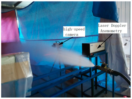 The experimental measurement system was tested in the Mine Fluid Control Laboratory. The setup was surrounded within a plastic curtain to maintain an enclosure space and avoid air flow that could cause errors. The hydraulic pressure gauge was used to monitor and maintain the spray pressure at its preset value. A flow meter was used to record the nozzle flow rate and a high-speed camera was used to capture the velocity of movement and atomization angle of fog particles. Meanwhile, the distribution of fog particles size was measured by the DP-2 particle size analyzer at different locations by changing the relative position of the nozzle. The experimental site is shown in Figure 3.
