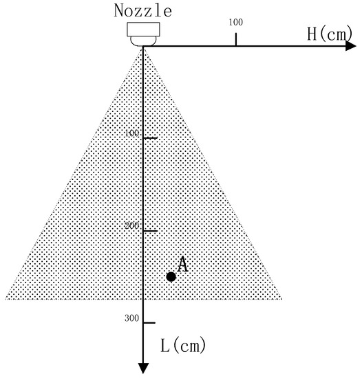 For analysis and recording, a coordinate system (Figure 4) was established in the spray area. The horizontal axis H and vertical axis L are in the radial and axial directions of the nozzle, respectively, and the unit is cm. For example, point A in Figure 4 indicates that laser position is 250 cm from the axial direction of the nozzle and 20 cm from the radial direction of the nozzle.