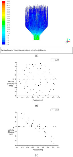 Figure 5c,d show the velocity distribution on the nozzle outlet face along the L-direction. Figure 5c shows that when the swirl nozzle is used at a given position, the velocity varies more evenly in a large range with the maximum velocity being about 8 m/s. However, the traditional nozzle produces a flow field (Figure 5d) in which the velocity distribution forms a narrow band with the maximum velocity being only 3 m/s. They have same axial velocity but different tangential velocity. As indicated by Equation (1), the faster tangential velocity can produce tinier water droplets for capturing dust particles.