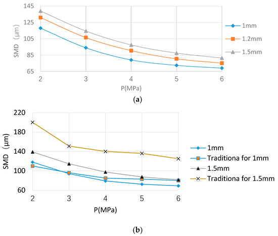Size of droplets (Sauter Mean Diameter, SMD) in different spray pressures (P) and nozzle diameters. (a) SMD and spray pressures for three nozzle apertures. (b) The comparison between the nozzle and the traditional nozzles in the SMD.