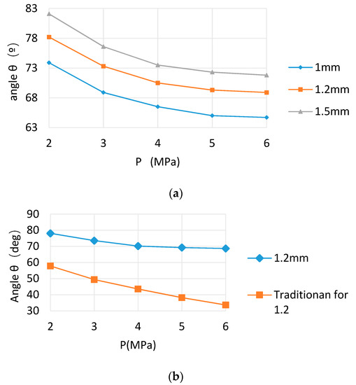 Figure 7a shows the relationship between the atomization angles and spray pressures for three nozzle apertures. It can be seen that the atomization angle reduces when the spray pressure increases from 2 to 4 MPa, and the atomization angle reduces slowly when the spray pressure is above 4 MPa, and even more slowly above 5 MPa. Although Figure 6 and Figure 7 share the similar trends, Figure 6 is caused by high-speed secondary breakup [41], and high speed aerodynamic force can lead to the droplets’ SMD decreasing rapidly when the pressure is less than 4 MPa and decreasing slowly above 5 MPa. Figure 7b shows the comparison between the nozzle and the traditional nozzles in the spray angle. For 1.2 mm diameter, as an example, the SMD of this swirl nozzle is smaller than that of the traditional nozzles from 2 MPa to 6 MPa. The decrease of atomization cone angle leads to the continuous reduction of the effective dust fall area of fog flow, which is not conducive to the capture of coal dust [4].