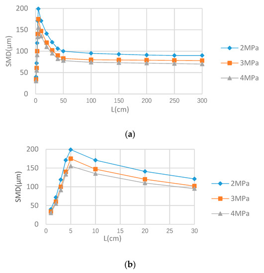 Figure 6a shows that the SMD curve is varied with spray pressure and nozzle diameter. When the spray pressure is less than 4 MPa, the droplets’ SMD decreases rapidly with the increase of spray pressure. When the spray pressure is above 5 MPa, the droplets’ SMD decrease slowly with the pressure. This indicates that the spray pressure has a significant effect on liquid atomization. As the kinetic energy of the droplets increases with the spray pressure, the higher kinetic energy is most likely to cause breakage of larger droplets into smaller ones. Figure 6 also shows that when the spray pressure reaches 5 MPa, even if the spray pressure continues to increase, fog particle SMD will not be reduced greatly. In other words, Figure 6a shows that at the same spray pressure, smaller nozzle aperture can produce smaller particle. Figure 6b shows the comparison between the nozzle and the traditional nozzles [40] in the SMD. The SMD of this swirl nozzle is smaller than the traditional nozzles for 1.5 mm and this swirl nozzle is smaller than the traditional nozzles for 1 mm when the spray pressure is above 3 MPa. According [4,5], better dust removal can be achieved using smaller diameter particles.