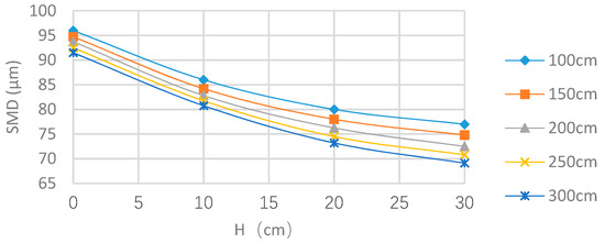 Figure 9 shows the distribution of particle SMD in the radial direction in the spray field at different axial positions. It can be seen that the particle SMD is larger in the center of the fog than in the rim, and droplets diameter gradually decreases along the radial direction. Because a large number of fog particles exist near the nozzle, at this point, the outside air cannot be sucked into the internal fog field to mix fully with fog particles, which depresses the degree of fog particles breaking. Therefore, near of the nozzle, there are more concentrated fog particles and greater fog particle SMD. In contrast, a large amount of air is sucked into the fog field at further distances away from the axial line of the fog field, and many tiny particles produced by first and second breakup [30] are transported to the spray boundaries by the drag forces from the surrounding air and, therefore, the fog particles’ SMD are smaller than that of particles in the center field.