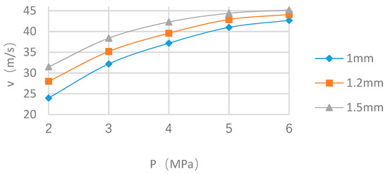 The velocities of droplets were investigated at different spray pressures and at different axial distances and are shown in Figure 10 and Figure 11, respectively. Figure 10 shows that at a point in the fog field, the speed of fog particles increases with the increase of spray pressure. For example, when the nozzle aperture is 1.2 mm, when spray pressure is increased from 2 to 3, 4, and 5 MPa, the speed of fog particles is increased from 28 m/s to 43 m/s. However, above 5 MPa, the growth rate of fog particle speed tends to be small. At the same time, Figure 10 also shows that the small nozzle aperture has smaller fog particle speed than that of the large nozzle aperture at the same spray pressure.