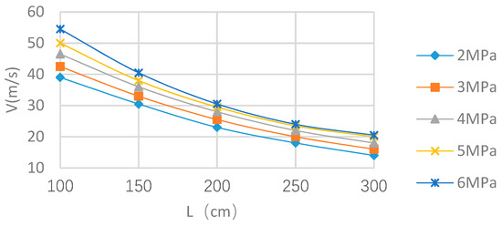 Figure 11 shows the relationship between the velocity of fog particles and the axial distance from center of the fog field. It indicates that the velocity of fog particles decreases gradually when the axial distance increases in the fog field at different spray pressure. For example, at 5 MPa, the axial speed is 50 m/s at 100 cm and then is reduced to 20 m/s at 300 cm. This is because when the nozzle’s high inner pressure sprays out the fog particles with high speed relative to the air speed, a large part of the kinetic energy of the fog particles is used to overcome air shearing and resistance. In this process, the larger diameter of fog particles is sheared and broken, the kinetic energy of the fog particles is further lost, so that the speed of fog particles reduces sharply. With the speed of fog particles decreasing, the shear effect of air on fog particles gradually reduces, the possibility of shear crushing and the loss of energy of fog particles are reduced and, therefore, the fog particle speed rate decreases gradually with the increase in axial distance.