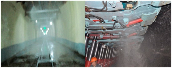 The swirl nozzle was used in a coal mine for spraying and dust settling as shown in Figure 12. It can be seen that the swirl nozzle sprays out tiny water droplets regularly. Inspectors in the coal mine had monitored coal dust concentration regularly, and they compared that with the results after the swirl nozzle was used; the data are listed in Table 1. The data in Table 1 are the average of five measurements. Table 1 shows that the swirl nozzle had very good application effects in dust settling, such as at the 1035 east tunnel of the coal mine where the dust concentration was 8.5 mg/m3 using a traditional nozzle, while after using the swirl nozzle, coal dust concentration was reduced to 6.51 mg/m3; the coal dust concentration was decreased by 23%.