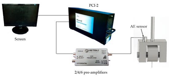 Meanwhile, mode 2/4/6 pre-amplifiers (Figure 4) were chosen to amplify the AE signals collected by the R6a sensor, and its gain was set to 40 dB. To shield the signals from low-amplitude background noise, a threshold was set. Usually, the threshold was 45 dB, which meant that only these AE signals whose amplitude was over 45 dB could be collected by the PCI-2 system. A diagram to illustrate the instrument connection is shown in Figure 4.
