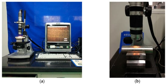 A VHX-600E digital (from Keyence, Osaka, Japan) microscope (as shown in Figure 5a) was used to observe the worn surface of the pins, and to create the 3D models of the worn surfaces. The scope had a varying-focus lens from 20× to 200×, and the observation range was from 19.05 to 1.14 (mm). When the specimen stage moved 15 mm, the repeat position precision was ±0.5 µm. A V-shaped support was used to support the pin (as shown in Figure 5b).