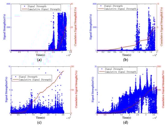 The signal strength and the accumulative signal strength: (a) The first specimen; (b) the second specimen; (c) the third specimen; (d) the fourth specimen.