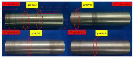 As shown in Figure 7, the surfaces of the four worn specimens had grooves that were visible to the naked eye. Detailed information is summarized in Table 2. There were similar distributions of grooves on the middle of the first, third and fourth specimens surface (Figure 7). However, the number of grooves was different. The first, the third, and the fourth specimens, respectively, had 12, three, and four obvious grooves. Considering the size and location of the U-shaped part and the circular part, it was found that wear occurred in the contact area between the circular part and the pin. In contrast, three obvious grooves were distributed on the end of the second specimen surface (Figure 7), which means that wear occurred in the contact area between the U-shaped part and the pin. Rough surface and uneven lubricant distribution may cause the phenomenon.