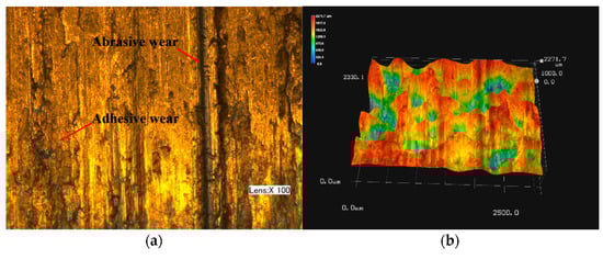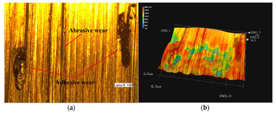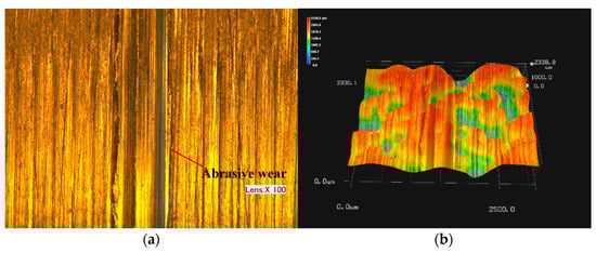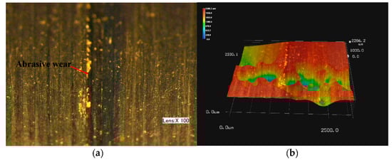 Figure 8, Figure 9, Figure 10 and Figure 11 are micrographs showing the wear track of the pin specimens. The different wear forms, including abrasive wear and adhesive wear, can be identified from these micrographs, which verify the prior prediction of different wear forms at the end of Section 3.1. There were some obvious grooves in the third and the fourth specimens (Figure 10 and Figure 11), and these grooves were along the rotation direction of pins, and they distributed on the surface of the pins. Obviously, the characteristics of these wear were similar to that of abrasive wear that has been described in the introduction; therefore the type of damage was abrasive wear, and the average depths of wear in the third and fourth specimens were 2060.7 µm and 2235.3 µm, respectively. On the other hand, the surface of the first and the second specimens (Figure 8 and Figure 9) were rough, and the trails of the transfer particles adhering to the surface could be seen, and different depth pits distributed here. The reason for this was that during the process of rotation, the surfaces of pins were repeatedly squeezed, and some debris would be peeled off from the surface. Meanwhile, grooves could also be found on the surfaces of the first and second specimens. That meant that the damage of the first and the second specimens were associated with not only abrasive wear but also with adhesive wear. Moreover, the average depths of wear in the first and second specimens were 2190.375 µm and 2137.925 µm, respectively. Comparing the average depths of wear in all four specimens, it was found that the average depth of wear was similar in this experiment.