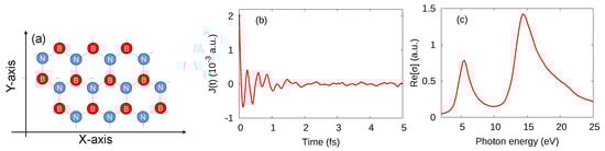 (a) atomic configuration of monolayer h-BN; (b) current density in time domain after the impulsive distortion at ; (c) real-part of surface conductivity, , of h-BN, calculated by TDDFT with ALDA.