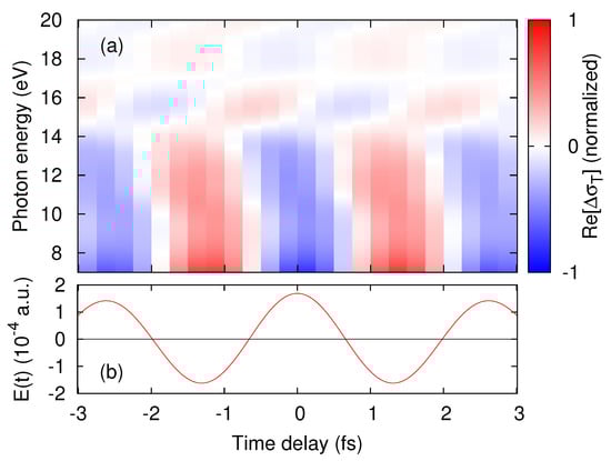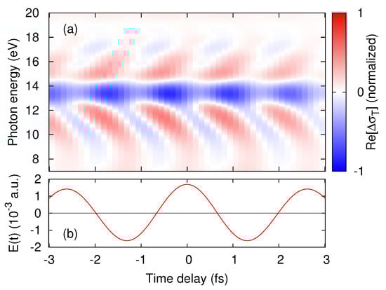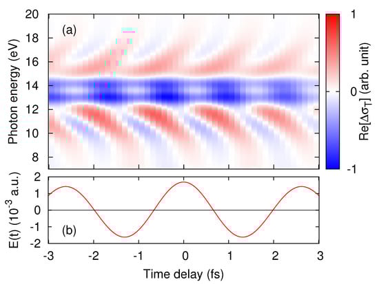 Figure 2a shows the real-part of the transient conductivity computed by the TDDFT pump–probe simulations. The time-profile of the applied pump electric field is also shown in Figure 2b. In Figure 2a, one sees an oscillatory feature with a V-shaped energy dispersion around 15 eV, which we shall call fishbone structure. As seen from the figure, the frequency of the oscillation in time domain is twice that of the pump frequency . The -oscillation is a direct consequence of the inversion symmetry of the material in the pump–probe direction, which forbids even-order nonlinear responses, because materials with inversion symmetry must show the same response regardless of the sign of the electric field along a symmetry direction. Similar features have been observed in attosecond transient absorption spectroscopy for semiconductors [10,13], and transient terahertz absorption spectroscopy for GaAs quantum wells [39]. These features of bulk materials have been discussed on the basis of the pump-induced intraband transitions and the dynamical Franz–Keldysh effect [40,41]. The dynamical Franz–Keldysh effect is a modification of optical properties of solids under the influence of oscillatory electric fields. It originates from the field-induced intraband transitions via the modification of the dynamical phase factor.