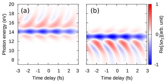 Despite of the qualitatively different time-domain structures between Figure 2 and Figure 6, both pump–probe configurations show characteristic features in the same photon energy region around 15 eV. According to the above study with the electron-hole pair distribution in Figure 3 and the two-band model analysis, these features might also be related to the anomalous dispersion of the negative-mass electron-hole band around the M point since the photon energy of 15 eV is close to the transition energy of the negative-mass electron-hole pair at the M-point.